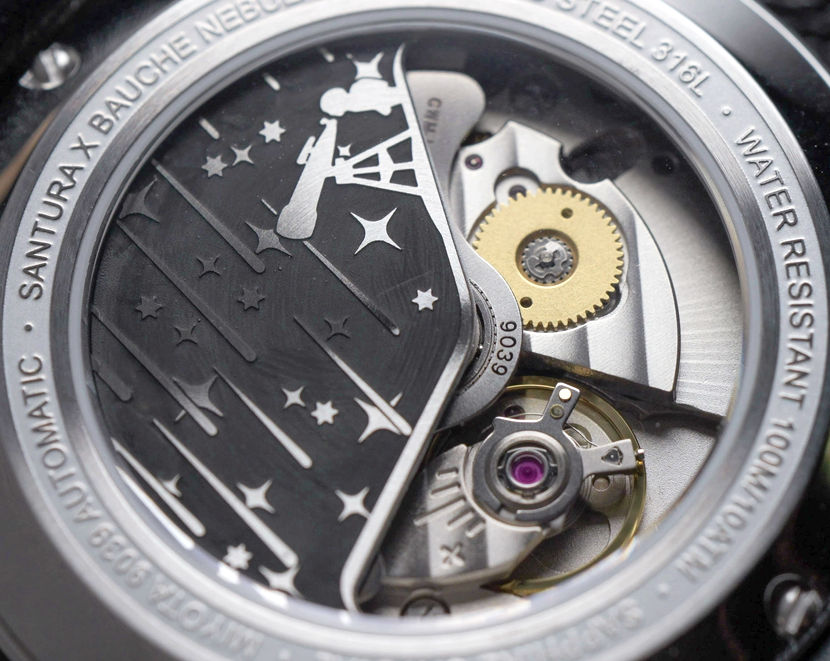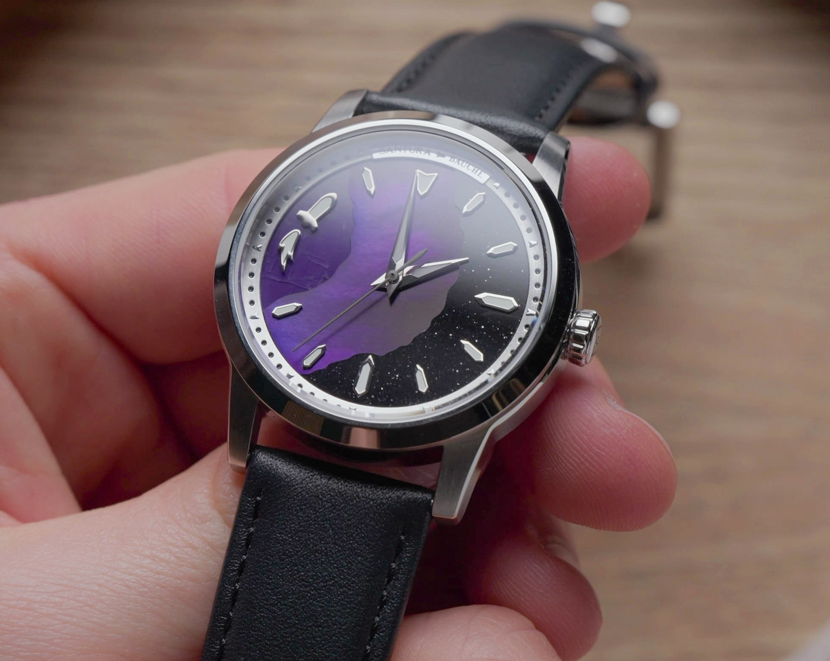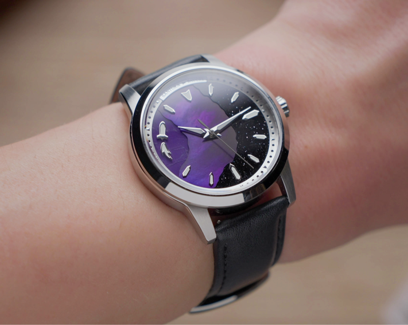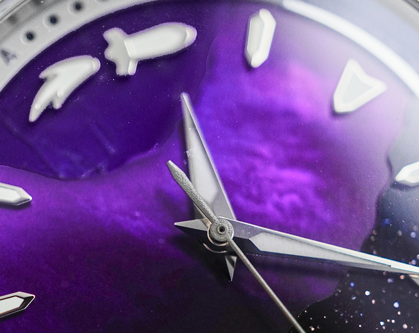 Adding a touch of whimsical exploration, a small rocket motif replaces the 9 and 10 hour markers, subtly skewed to complement the watch’s visual tension and poetic imbalance. This asymmetry evokes the quiet disarray of celestial drift, a design language shaped by the unpredictable beauty of the nebula.