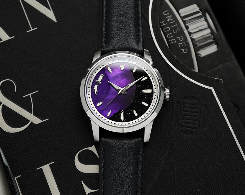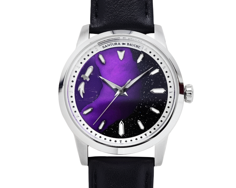 At its heart lies a tri-layer dial construction combining the Amethyst stone with a Purple fume mother-of-pearl dial and Black aventurine glass, orbiting within the brushed elegance of the Santura Novus case.